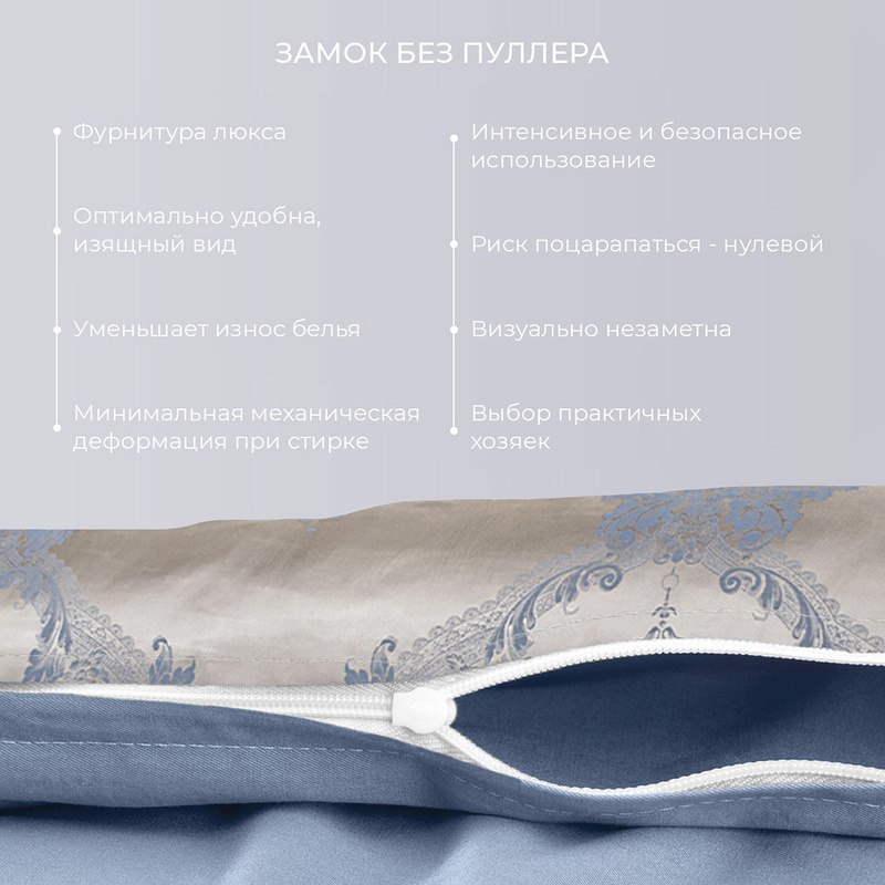 Наволочки комплекта украшены широкими декоративными воланами – «ушками», в пододеяльник вшита молния, это значительно облегчает заправку одеяла. Постельное белье изготовлено из гладкого шелковистого хлопка-сатина высокой плотности, это очень красивый и прочный материал. Ткань с сатиновым плетением не деформируется и не дает усадки, цвета этого постельного белья не поблекнут после многократных стирок.