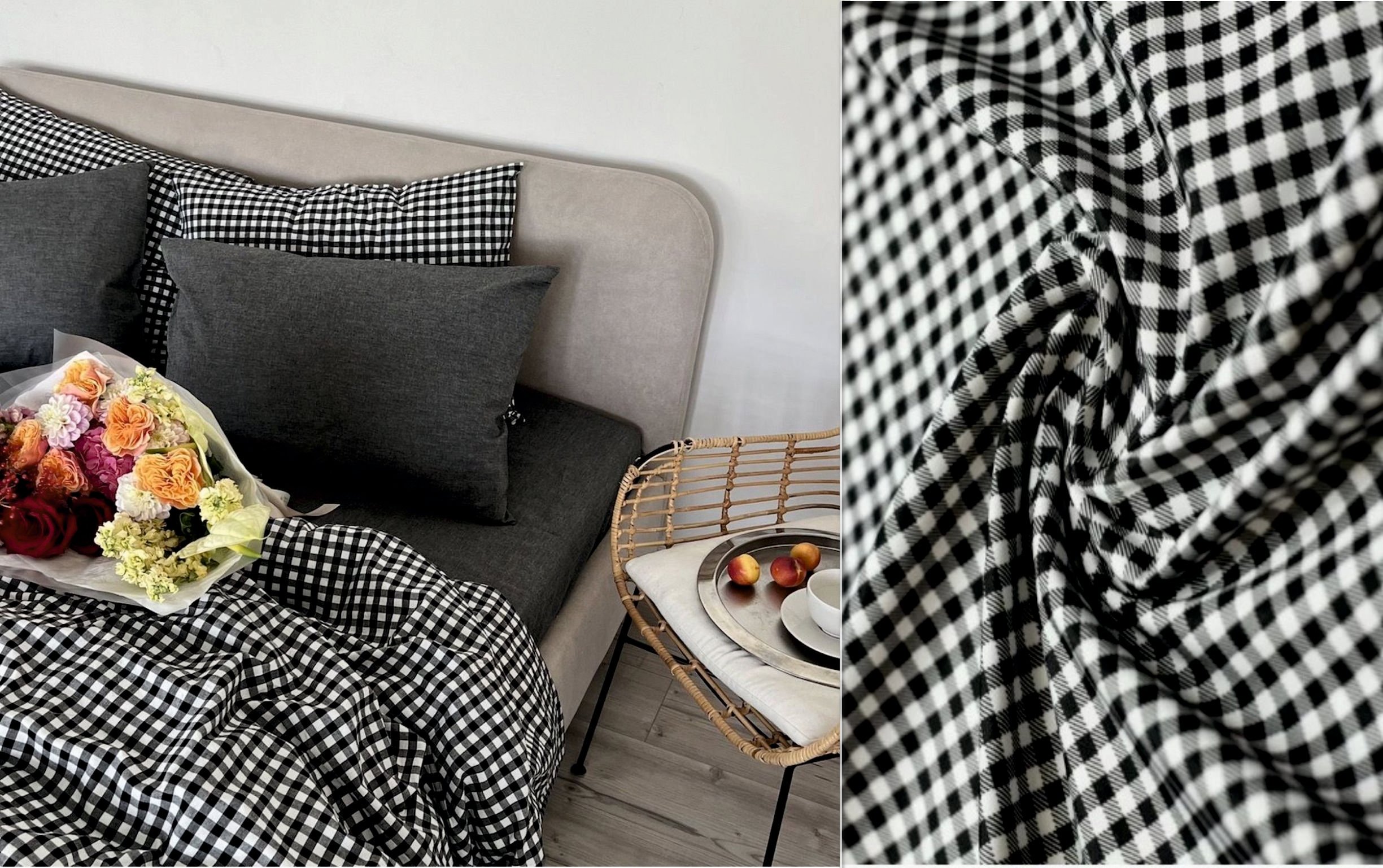 КПБ Евро с простыней на рез. 180х200 ВАРЕНЫЙ ХЛОПОК "Клетка черно-белая+графит меланж"